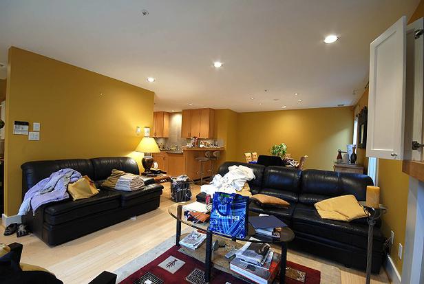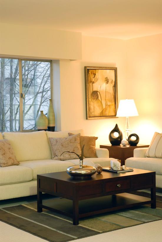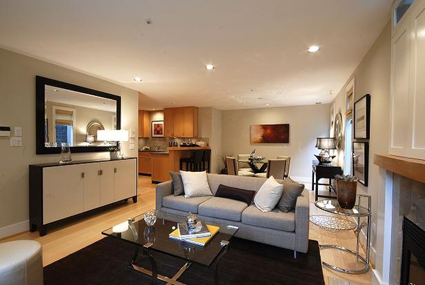 But there is an art to making an open concept home look great and work well. For starters, it’s important for all the elements in the living areas work together and that the adjoining areas are cohesive. When I stage an open concept home, I start by using a monochromatic color scheme. Also, furniture can be placed to create different seating areas to break up a larger space. Examples would be maybe two large, comfy chairs by the fireplace, a leather reading chair by a wall of books to give the library effect, a conversation area, a tv lounging area…you get the picture. Since there is no division between rooms, another way to define spaces is to use area rugs. Take a look at the photo below.