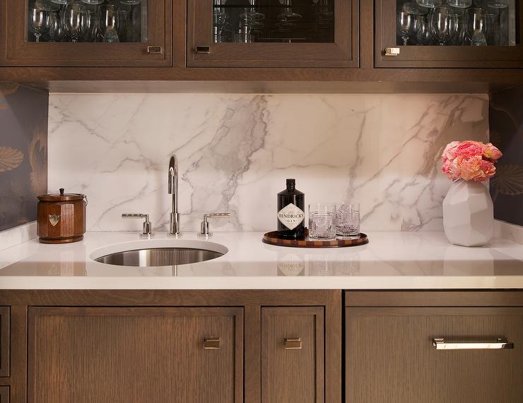 Sheet backsplash is becoming very popular. The continuous material is very functional as it eliminates the need for grout, making cleanup super easy. It’s also sleek and doesn’t compete with some of the busier granite counter tops with lots of movement. Here are a few examples in glass, quartz & stainless steel.